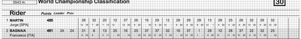 A Sepang (Malesia) si è concretizzato anche il sesto hat-trick nella massima cilindrata. Statistiche significative, ma il titolo quasi sicuramente andrà a un altro. Quest’altro è lo spagnolo Jorge Martin che, pur avendo vinto molto meno di Pecco la domenica (3 GP), è stato decisamente più continuo e con molti meno “zeri” nella graduatoria iridata. Sono appena tre gli spazi vuoti nella tabella dell’iberico (due GP e una Sprint Race).