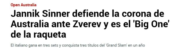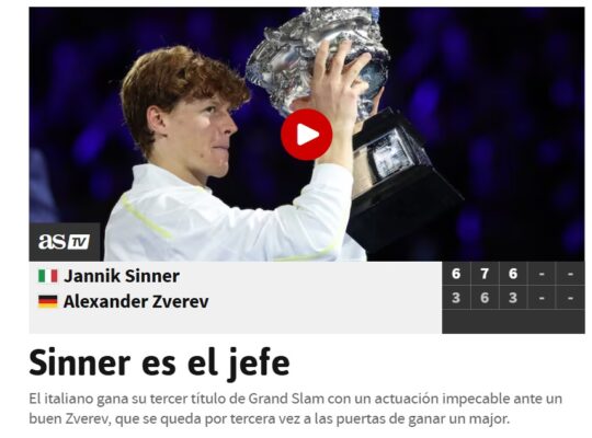 Il campione nostrano è stato celebrato anche dalla stampa estera nella maggior parte dei casi. In Spagna, non sono mancati articoli volti a sottolineare la grandezza di Jannik. MARCA ha titolato: “Jannik Sinner difende la corona australiana contro Zverev ed è il Big-One della racchetta“, evidenziando come il rendimento del pusterese sia in scia a Roger Federer, Rafa Nadal e a Novak Djokovic.