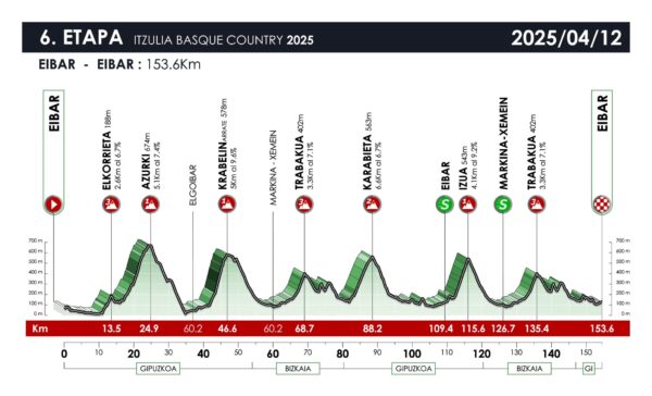 Non ci sarà un attimo di tregua: sette GPM in programma, il primo poco dopo il via, quello di Elkorrieta (2,6 km al 6,7%). Neanche il tempo di respirare ed ecco la salita di Azurki (5,1 km al 7,4%). Discesa e si sale verso Krabelin (5 km al 9,4%), ascesa molto dura. Non è finita qui Trabakua (3,3 km al 7,1%) anticipa Karabieta (6,6 km al 6,7%) prima del gran finale. Prima la salita verso Izua (4,1 km al 9,2%) e poi quella di Trabauka (3,3 km al 7,1%). Non è finita comunque qui: negli ultimi 20 chilometri diversi strappi prima del traguardo.