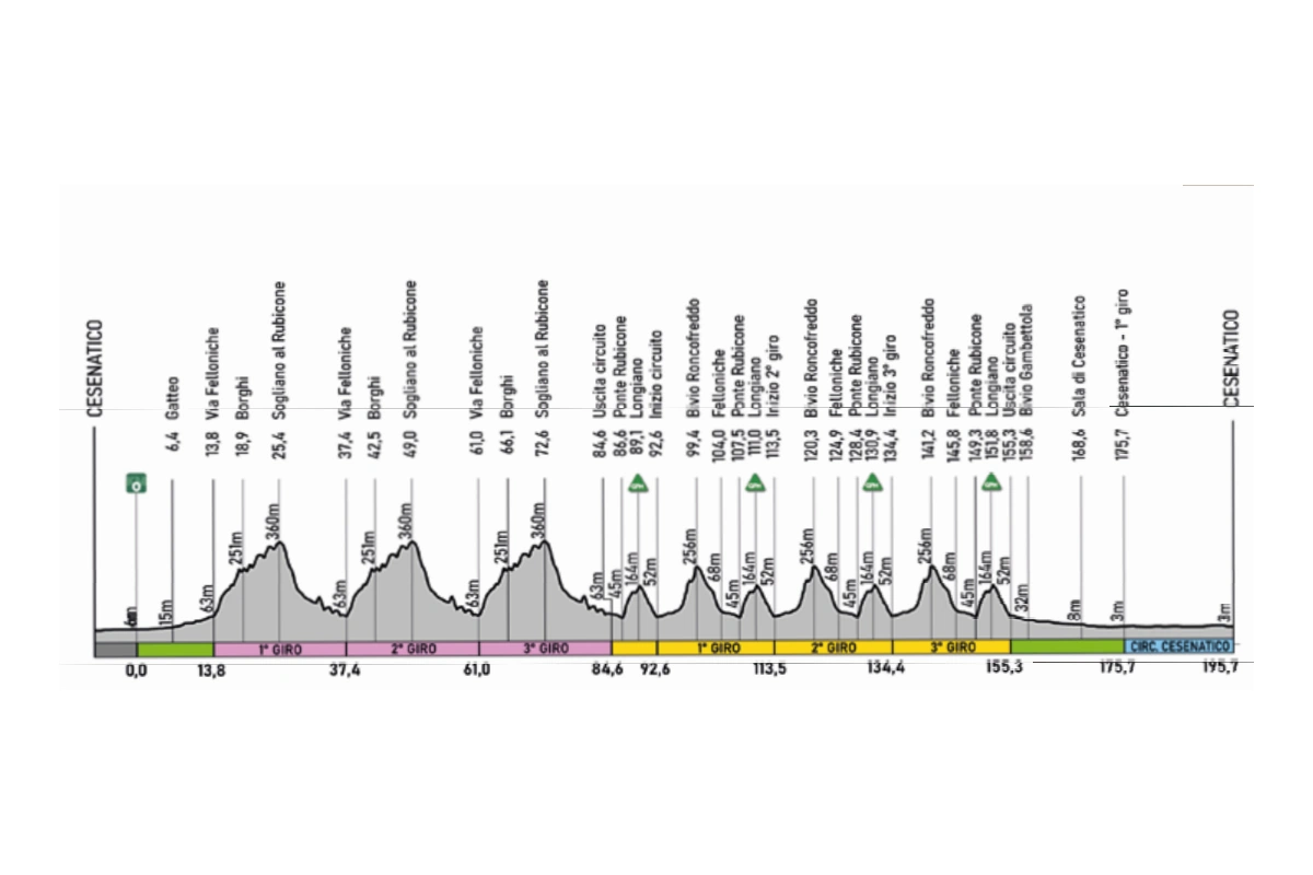 I corridori, pochi chilometri dopo la partenza, entrano nel circuito di Sogliano dove affrontano, per tre volte, la salita di Sogliano al Rubicone, 10.9 km ad una pendenza media del 2.6%, e lo strappo di Montalbano, un chilometro al 7% di pendenza media. Il secondo circuito di giornata propone i quattro passaggi sulla salita di Longiano, 2,7 chilometri al 4,1%, e i due sullo strappo di Roncofreddo. Nel finale si torna in pianura e la corsa si conclude con i quattro giri del circuito di Cesenatico.