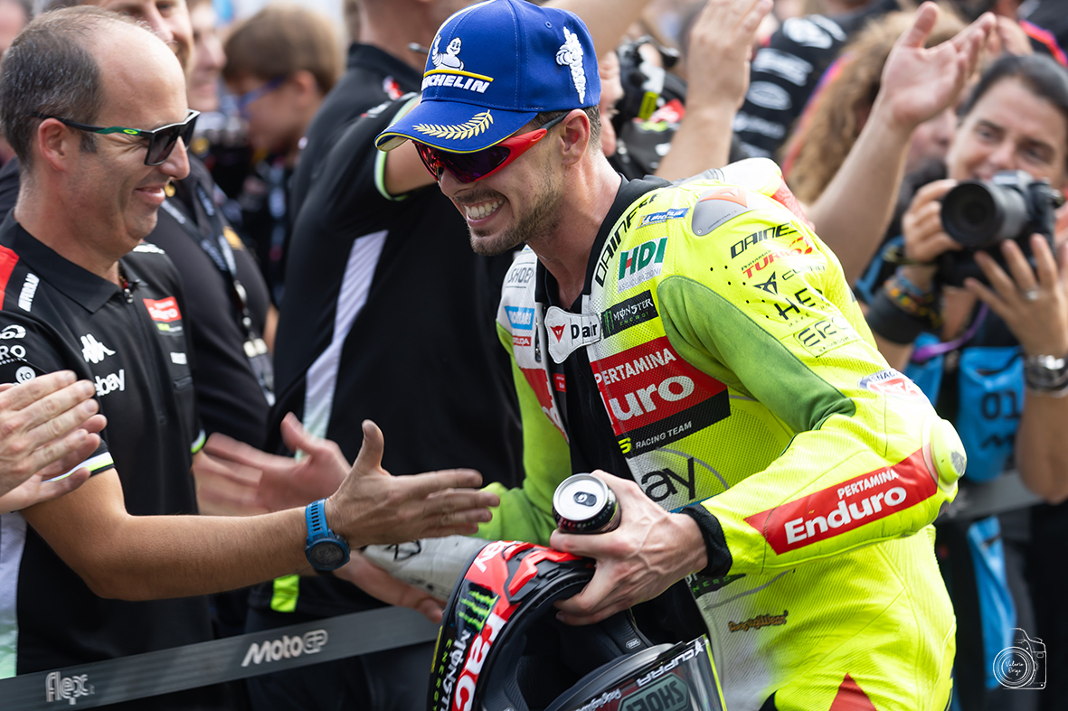 Il pilota del Team Aprilia si è così ripreso la prima posizione, davanti alla Ducati di Alex Marquez che non è riuscito a raggiungere il riminese, terminando la prova al secondo posto (+1.026). Seconda vittoria in carriera nelle gare del sabato per l’azzurro, l’ultima volta fu ad Assen nel 2023. Terza piazza per la Ducati VR46 Racing Team di Fabio Di Giannantonio (+2.680).