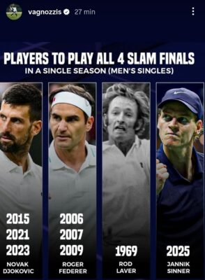 Sinner, infatti, è diventato il quarto giocatore della storia nell’Era Open a raggiungere la finale in tutti e quattro gli Slam nello stesso anno. Prima di lui solo tre tennisti: Roger Federer (2006, 2007, 2009), Novak Djokovic (2015, 2021, 2023) e Rod Laver (1969). Un riscontro straordinario (ricordando anche le due vittorie a Melbourne e a Londra) che, senza lo stop di tre mesi per la vicenda “Clostebol”, gli avrebbe permesso di conservare la vetta della classifica mondiale.