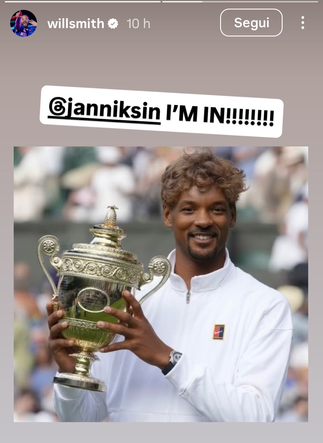 In mattinata è arrivata la replica di Will Smith, che ha pubblicato un post su Instagram candidandosi al ruolo. La star ha infatti taggato il tennista italiano e ha scritto “I’m In” (ci sono), accompagnando il messaggio con diversi punti esclamativi e con una foto già entrata in trend: allo scatto di Sinner con in mano il trofeo di Wimbledon è stato posto il volto di Will Smith, conservando i capelli rossicci del giocatore.