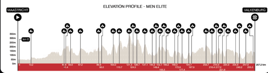 Come da consuetudine la corsa parte da Maastricht e dopo 13,2 km il gruppo si trova ad affrontare il primo muro, il Maasberg. Dopo un tratto pianeggiante arrivano in rapida successione il Bergseweg, Korenweg, Nijswillerweg e poi dopo una decina di chilometri anche il Rijksweg. Seguono Wolfsberg e Loorberg, poi Schweibergerweg (2,4 km al 4,5%) e soprattutto il Camerig (4,6 km al 4%). Successivamente toccherà al Vaalserberg (2 km al 5,7%), che rappresenta anche l’unico sconfinamento in Belgio della corsa e poi Gemmenich, solamente 800 metri ma al 6,6%. Dopo aver superato anche lo strappo di Epenerbaan/Vijlenerbos (2,9 km al 3,7%) si arriva circa a metà gara, seguita dal tratto quasi pianeggiante con Epenerheide (1,4 km al 5,6%). La corsa si indurisce con il Gulperberg e poi in rapida successione arrivano Plettenberg, Eyserweg, Schanternelsweg e Vrakelberg. Poi arrivano Sibbergrubbe e soprattutto ecco il primo passaggio sul Cauberg (900 metri al 7,5%) con il successivo passaggio sul traguardo quando mancheranno ancora più di 80 chilometri alla fine. Le fatiche sono ancora infinite per i corridori. Dopo l’arrivo si affrontano Geulhemmerberg (1 km al 6,2%), Keerderberg e Bemelerberg (900 m al 4,6%), seguiti dal secondo passaggio sul Loorberg e e poi ancora Gulperberg, Kruisberg (700 metri ma all’8,3%) ed Eyserbosweg (1,1 km al 7,4%). Si entra nella fase decisiva della corsa dove ci sono il passaggio sul Fromberg (1,7 km al 4%), Keutenberg (1,6 km al 5,3%) e poi per la seconda volta arriva il Cauberg e qui mancherebbero 19,9 km al traguardo. Gli ultimi venti chilometri vedono prima un nuovo passaggio sul Geulhemmerberg (1 km al 6,2%). Poi è il momento del Bemelerberg (900 m al 4,6%) ed infine ecco il terzo ed ultimo passaggio sul Cauberg, dove si toccano anche punte dell’11%. Lo scollinamento sarà a 1700 metri dall’arrivo di Valkenburg.
