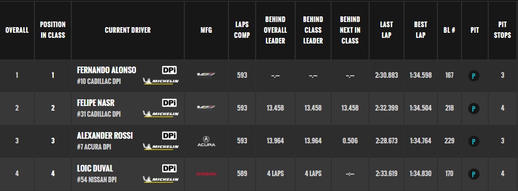 17.31 567 giri percorsi, Jordan Taylor su Cadillac al comando davanti a Alexander Rossi su Agura a 6.5 e Felpe Nasr su Cadillac a 8.0