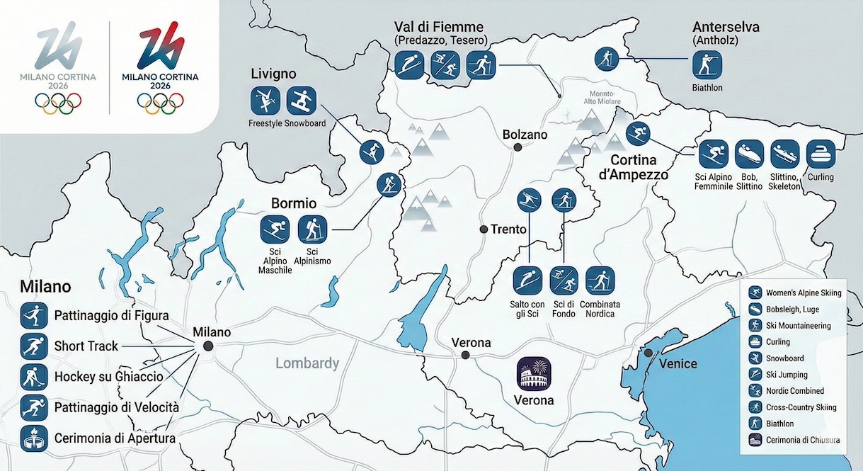 La distanza tra le venue (Milano e Cortina distano circa 5 ore di auto; Livigno è geograficamente isolata) rappresenta una sfida enorme per la mobilità di spettatori e addetti ai lavori, ma distribuisce l’impatto economico dei Giochi su un intero arco del Nord Italia.